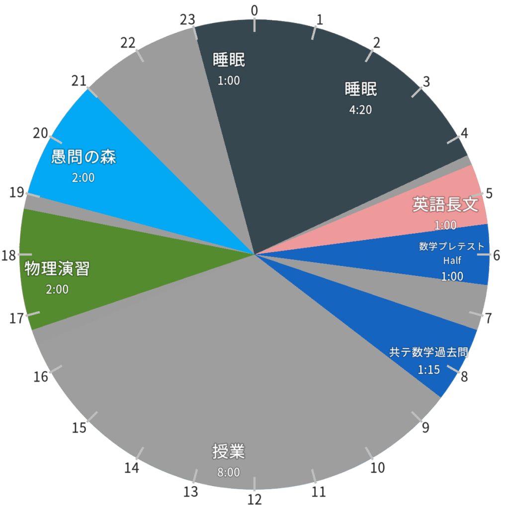 塾に入ってなかったので、朝はじいちゃんと競って4時半には起きて、家から5分で通ってた高校の空き教室と市民センターを時間いっぱいまで使って平日でも7時間、休日は最低10時間を目指して勉強してました(そのうちの何割が頭に入ってたのか…)
